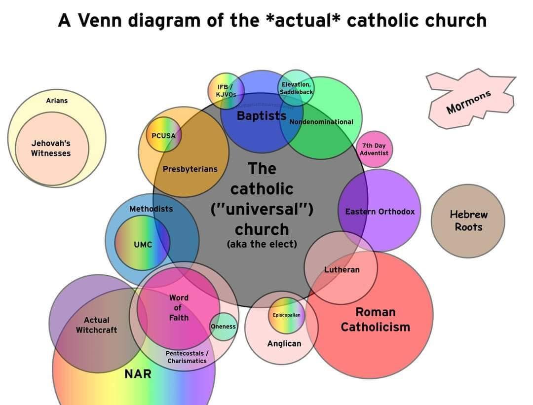The diagram below has been fuelling much discussion online in recent years. I credit its creation to Molinist Moose which I hope is accurate seeing as both mental thought and graphic design have gone into it. It certainly illustrates the corruption of much that passes for Christianity, while still allowing for individual congregations and members to be truly saved while existing in compromised denominations. It is mainly based upon the American scene though there is a clear parallel with British churches. Congregational churches like our own seem to have been exempted from the scrutiny, unless we count among the Baptists or 'Nondenominationals'. 'NAR' stands for New Apostolic Reformation, an American charismatic phenomenon with plenty of followers on this side of the Atlantic