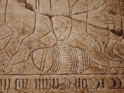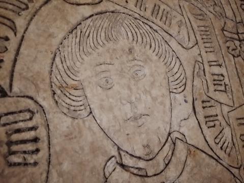 Andrew Jones died in 1497. He is buried somewhere in the crypt of Hereford Cathedral, which indicates he was both a man of means and a benefactor to that institution. His face looks a little naïve, but we cannot now tell if it is an accurate depiction or the limit of the artist's skill. His slippered feet rest upon a barrel which tradition suggests is for cider, Master Jones being a successful cider maker. It was certainly a profitable business judging by his wife’s attire and his own place in the cathedral's bosom.