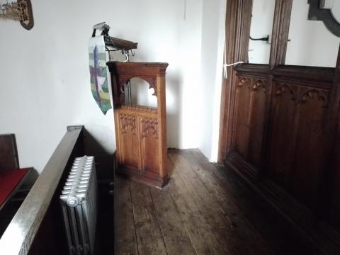 Haile Parish Church in Cumberland is one of those long, low structures for which the county is well known. Eighteenth-century with some older relics lying around, it had a nice, plain interior, and a wonderful arrangement of wooden roof beams. Despite some curious wall memorials, it was the pulpit, below, which most attracted my attention. Possessing its own, raised platform, it consisted of just a couple of carved screens, merely concealing the preacher’s legs from those sitting immediately in front of him. I have seen some imposing and tremendous pulpits in my travels, but Haile’s, while better than some scruffy music stand, is one of the simplest.