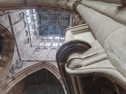 Curiously, a couple of carved faces appear on the pulpit, a man and a woman. As King henry VI and his powerful but unpopular Queen, Marget of Anjou, were based in Coventry for much of the Roses War and made Holy Trinity their church, it isa thought that the pulpit was erected for their benefit or honour. When the Yorkists won the war, the pulpit’s two erstwhile patrons were defaced, she especially so.