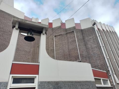 The Church of Saint Anthony of Padua, The Hague, was designed by Antoon van Kranendonk, and built between 1983-1984. This was to replace a temporary structure whose predecessor was destroyed by bombs in the War. The brick walls, sloping roofs and peculiar white decorations may be typical of that decade, though I initially thought it rather 1970s (architectural fashions do not neatly stop and replace themselves on the final 31st December at the end of each decade).