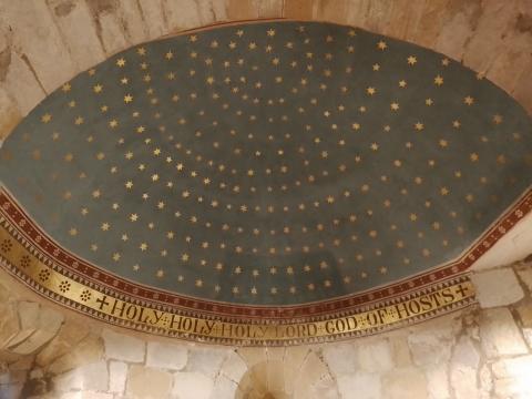 The apse ceiling at Old Bewick is painted blue with a star pattern in gold. Although it looks a little naïve artistically, it is thoroughly charming, and the words Holy Holy Holy, Lord God of Hosts appear beneath it, a reference to Isaiah’s great vision in the sixth chapter of his prophecy. Despite its fairly dark interior, the worship here was offered to the great God of heaven, the Maker of the cosmos. Worshippers within could not see the stars but they could, though faith’s eyes, behold something of the majesty of heaven. We might look up when we sing, but we are not addressing the beams; we might close our eyes when we pray, but we are not inspecting our lids. Rather, we pray, praise and petition the great God of heaven who dwells beyond the stars.