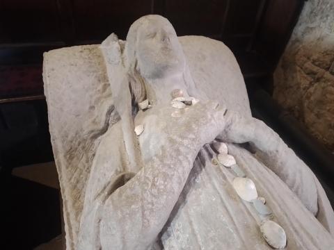 Another notable association is the tomb of Grace Darling, a nineteenth-century lighthouse keeper’s daughter. On a dark, windy night in September, 1838, she and her father attempted the rescue of the crew and passengers of the beleaguered paddle steamer Forfarshire, with some success and much heroism. She died herself four years later of tuberculosis, tended by the Duchess of Northumberland and known to Queen Victoria; she had become a national heroine. The effigy is movingly beautiful, and many visitors observe the custom of leaving a seashell upon it.