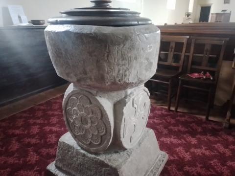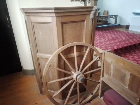 St James’ Church at Ireby, Cumberland, had a few unusual features when I called, such as a font I really struggled to date and a rather unusual, unplastered west wall. Although evidently Victorian, a medieval gravestone was built into the porch wall, suggesting that the current building replaced another of greater vintage. Despite these hints of antiquity, it was a fairly modern object which solicited my attention. By the pleasingly plain pulpit was a cartwheel. It had no sign of wear so it may have been made for its current, decorative usage, the real purpose of which remains unclear. Still, if any farmer of old-fashioned bent arrives to church in a horse and trap and loses a wheel along the way, all is not lost.