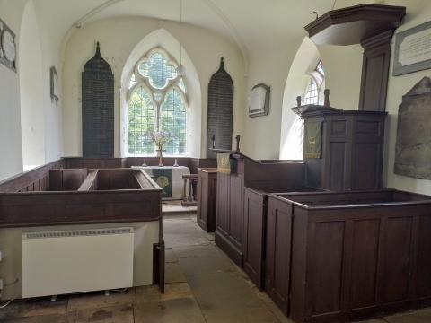 Never were two neighbouring churches offering so great a contrast. St Mary’s Church at Studley Royal is high Victoriana par excellence; it replaced St Lawrence’s Church, above and below, at nearby Aldfield which is a more typically Georgian preaching house. The former is longing for that medieval world of arches and incense; the latter loves the Common Prayer and the reading of the Authorised Version. St Lawrence’s ‘altar’ is off to the side, while the pulpit dominates the room. The eighteenth-century Anglican came to pray the familiar words of Cranmer’s liturgy and to hear the parson's preaching; the later, high Victorian came for visual delight and audible beauty. St Lawrence's is plain and dignified rather than busy and gaudy.
