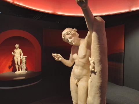 This first-century Roman statue of a youthful god, Apollo, shows him just about to kill a lizard which is climbing up a tree trunk he is leaning against. It may be a version of the tale in which he kills a great dragon or serpent called Python at the place he was to establish his temple and sanctuary at Delphi in Greece. The beautiful god, with his supple body and feminine face, appealed to the Greeks' and Romans' adoration of physical beauty.