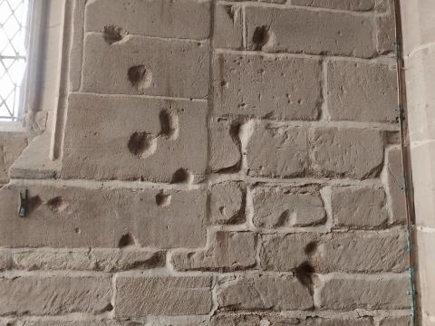 Strange pockmarks are observed on the western wall within the church, too, and also above the altar, at the east end. Evidently, the approaching roundheads were not deterred by the shots from the north door, nor from the tower. They gained entry to the church and gunfire was exchanged between the two sides, the depressions in the western wall originating from the King's men and the damage on the eastern wall from Parliament's muskets.